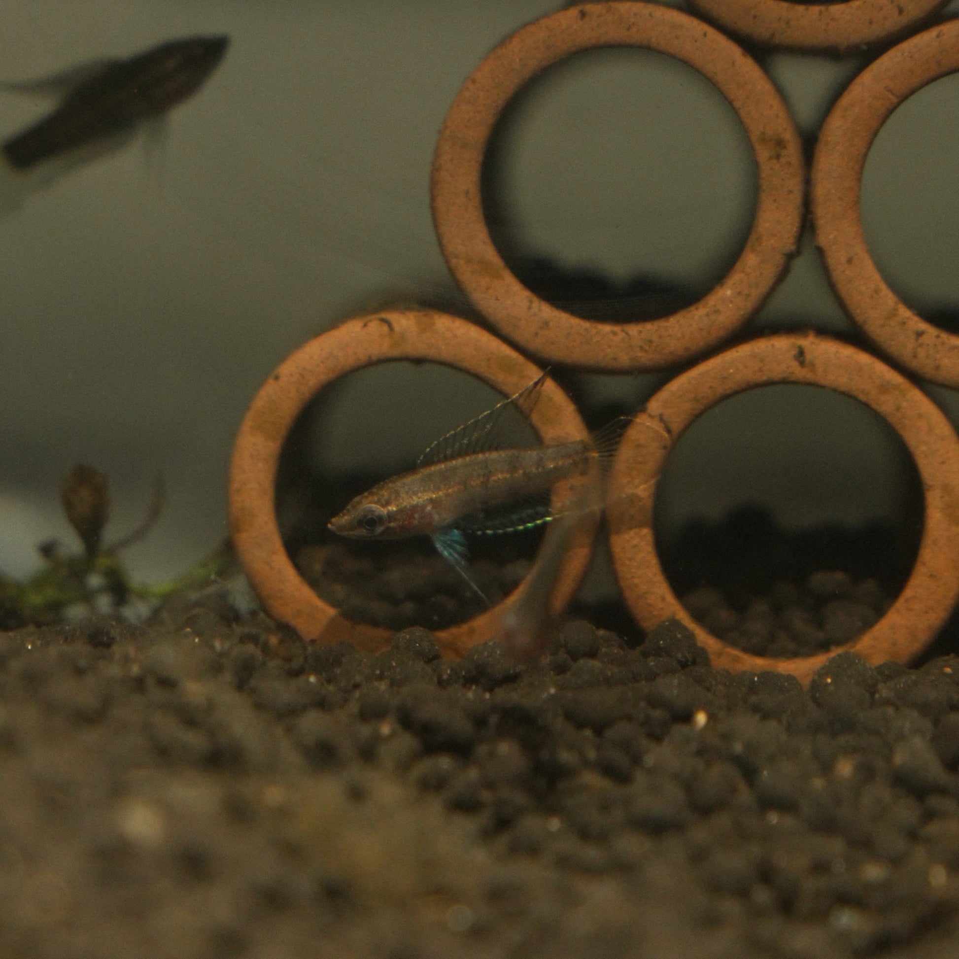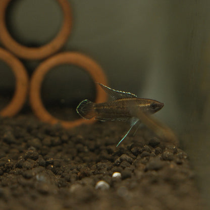 These fish are generally peaceful and shy, preferring to hide among the vegetation or other structures in their environment. They are carnivores, feeding on a variety of small invertebrates, insect larvae, and algae. They will ONLY eat live food!